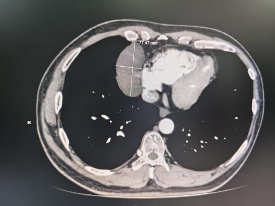44歲的文先生,在活動后常常出現胸前悶脹不適的癥狀。經過詳細檢查,發現其體內存在一個直徑約8cm的巨大右前縱隔腫物,且該腫物緊緊貼附在心臟表面,使得手術難度大幅增加,風險極高。若采用傳統的開胸手術,患者將面臨較大創傷、漫長恢復時間以及心肺功能受到較大影響的困境。
