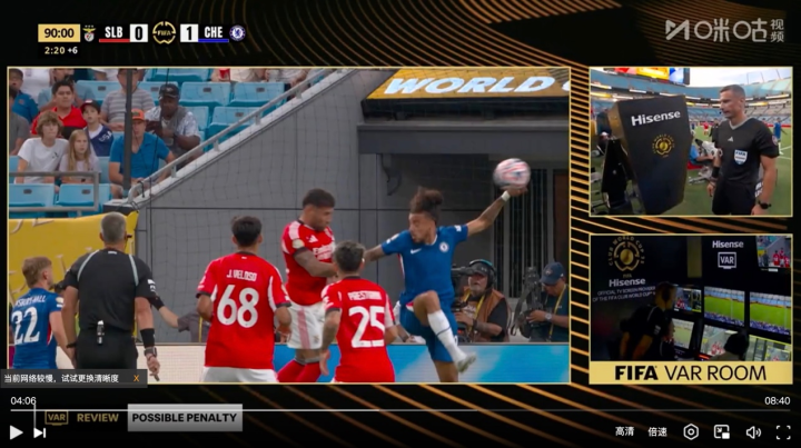 細心的球迷會發現,2025世俱杯的直播畫面跟過往的大賽相比有一些小變化:裁判在場邊看VAR的時候,同時有三個機位的畫面呈現在直播屏幕上,分別是疑似手球的慢鏡頭回放、主裁判站在場邊查看VAR的側面鏡頭、以及視頻助理裁判工作間里的鏡頭。
