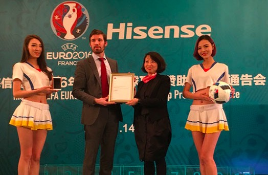 技術層面,他們實現了ULED動態背光技術量產,對比度超OLED,成本降50%,以此拿到了CES創新獎(這是美國國際消費類電子產品展覽會為表彰杰出的設計和工程所設立的獎項,分量很重)。市場層面,他們收購了日本品牌夏普的墨西哥工廠,把北美地區的產能提升到300萬臺/年。營銷層面,他們決定成為2016年歐洲杯和2018俄羅斯世界杯歐洲區預選賽的官方贊助商——這一步已經不可避免。
