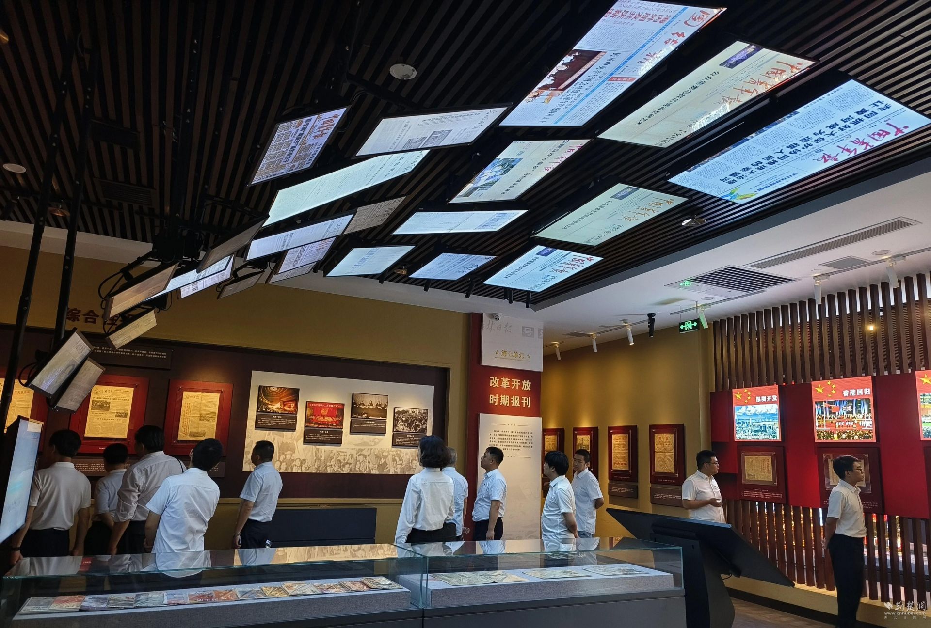 在講解員的帶領下,大家走進“沒有共產黨就沒有新中國——百年報刊展”展館。展館以“時空”為概念,以報刊造型為主元素,按照中國共產黨的百年歷史脈絡,通過1000余件珍貴紅色報刊,全面展示了中國共產黨初創時期、大革命時期、土地革命戰爭時期、抗日戰爭時期、全國解放戰爭時期、社會主義革命和建設時期、改革開放和社會主義現代化建設新時期,到走進新時代的百年光輝歷程和偉大成就。