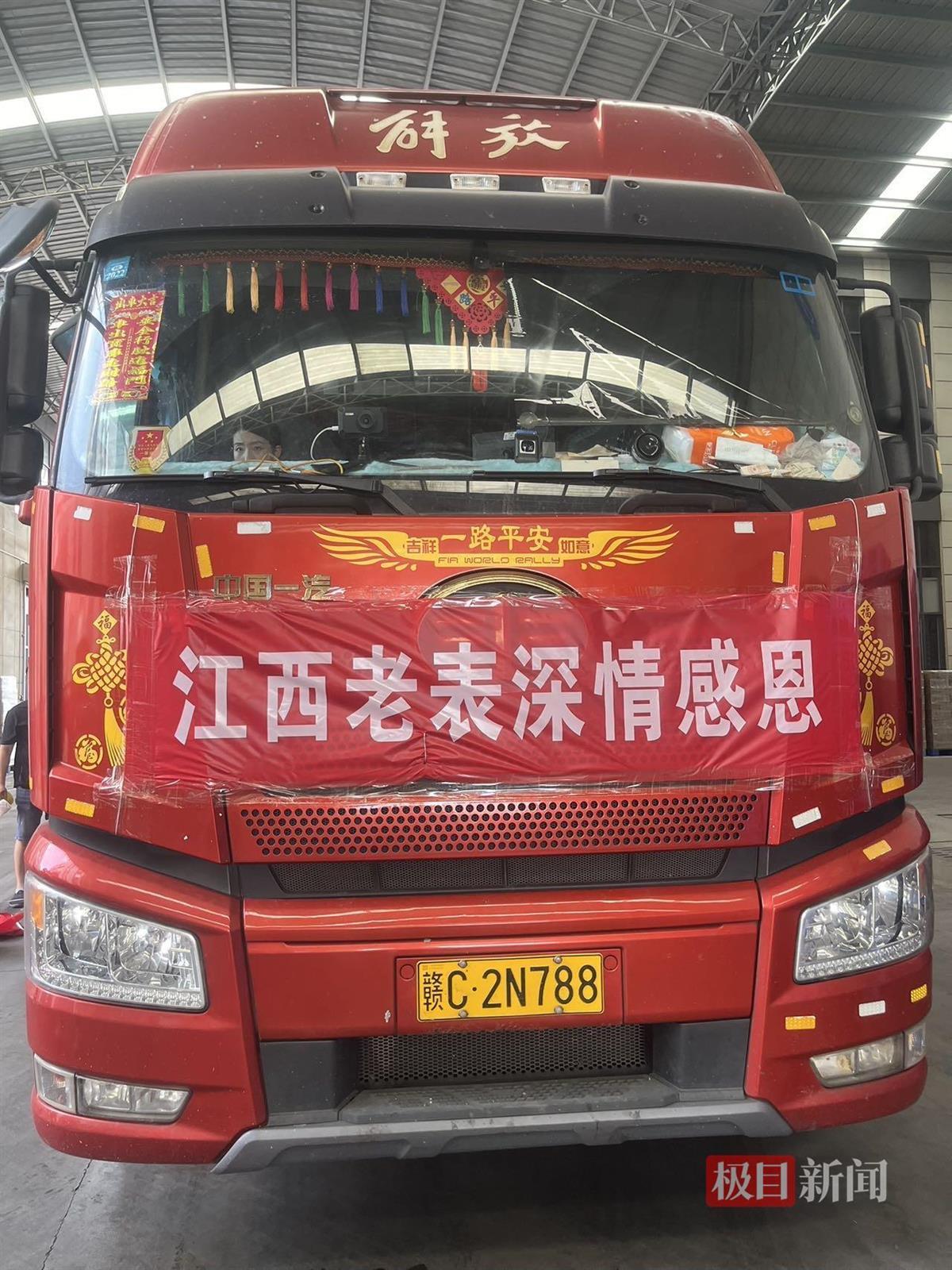 7月3日上午,“全網最幸運卡車司機”游國春的卡車掛上了愛心人士捐獻的橫幅,上面寫著“江西老表深情感恩”。