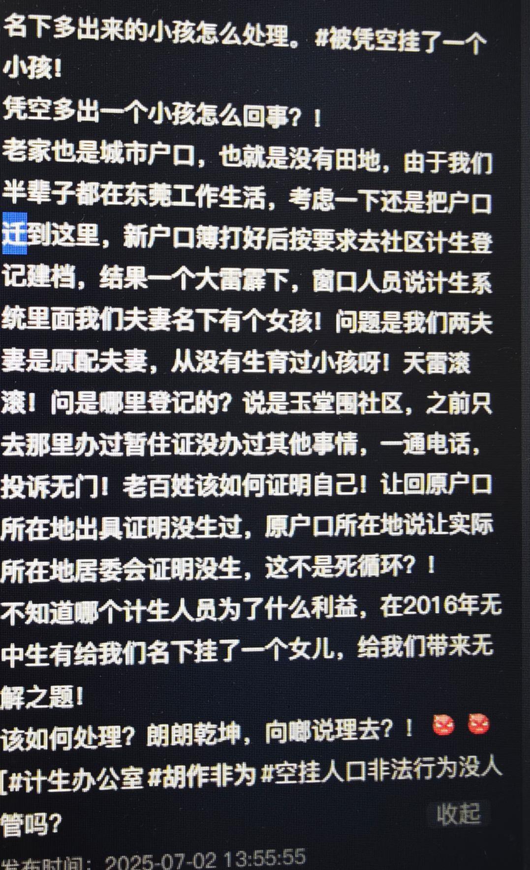 7月2日,有網友發帖稱,近期夫妻倆因需要遷戶口到東莞,新戶口簿打好后,按要求去社區計生窗口登記建檔,卻被窗口工作人員告知,計生系統內兩人名下多出一個女兒。