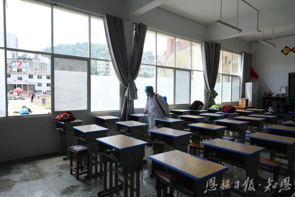 咸豐縣第二民族實驗小學正在進行消毒。 (朱超攝)
