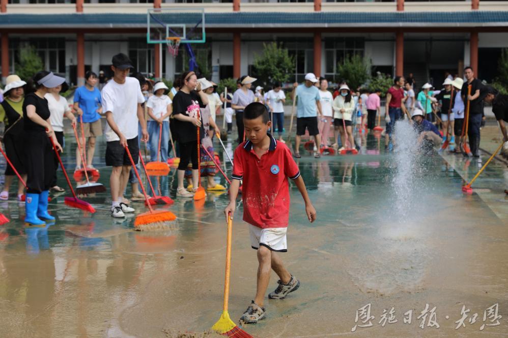 7月2日,咸豐縣第二民族實驗小學,學生、家長、社會志愿者沖洗淤泥。(朱超攝)