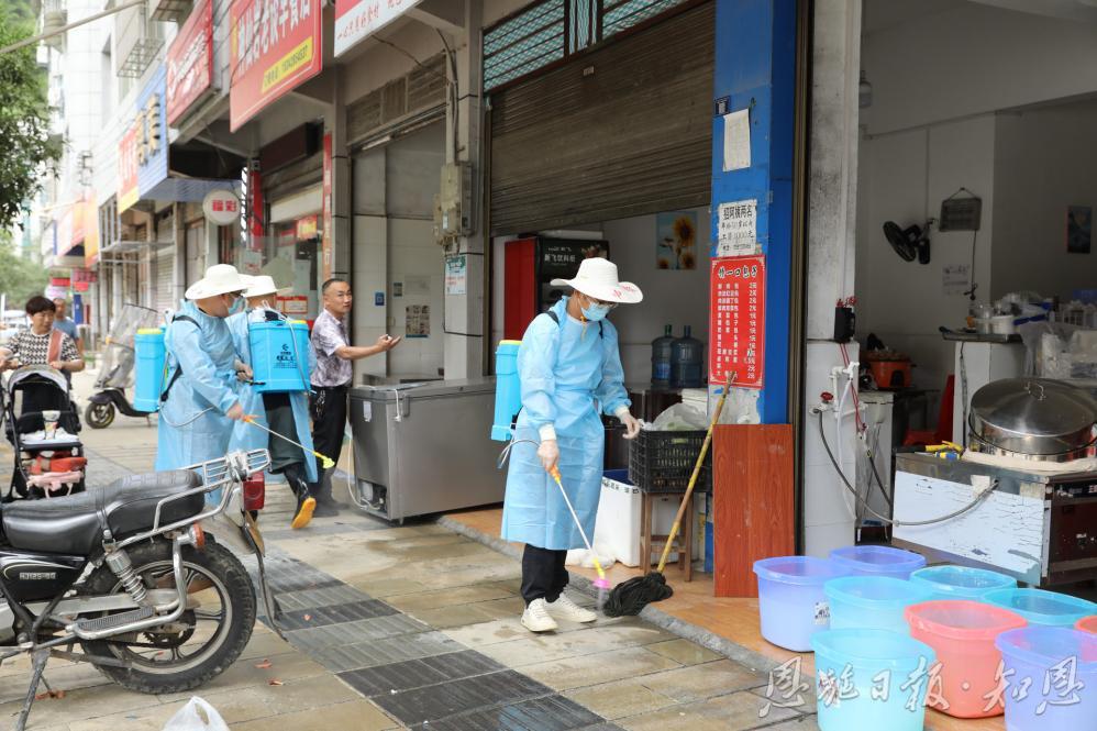 7月1日16時, 咸豐縣南門廣場附近, 社區干部沖洗居民門店設備。(朱超攝)