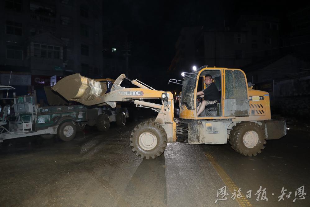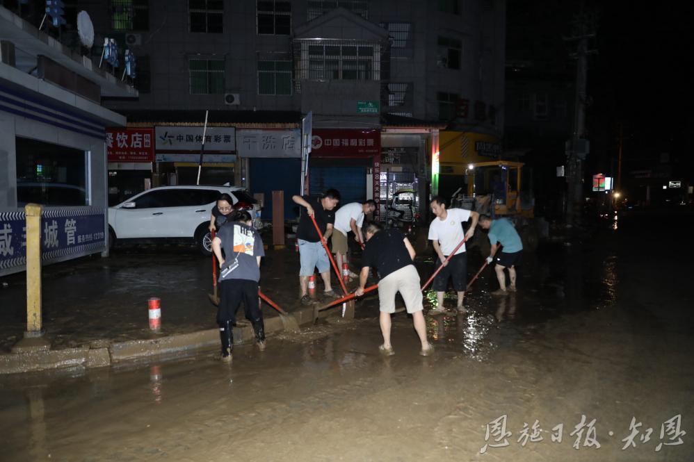 7月1日24時,咸豐縣南門廣場附近,社區干部正在清理道路淤泥。 (朱超攝)