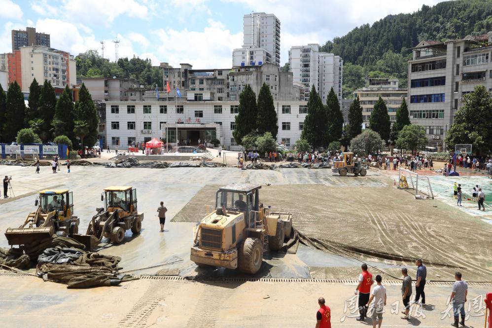 7月2日,咸豐縣第二民族實驗小學,鏟車清理操場雜物。(朱超攝)