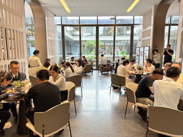 7月2日中午,記者在招商·武漢城建未來中心的銷售中心看到,洽談區12桌椅已全部坐滿,沙盤區、簽約區、茶水吧臺前擠滿咨詢客戶。置業顧問手持對講機穿梭帶看,樣板間門口甚至排起等待看房的隊伍。