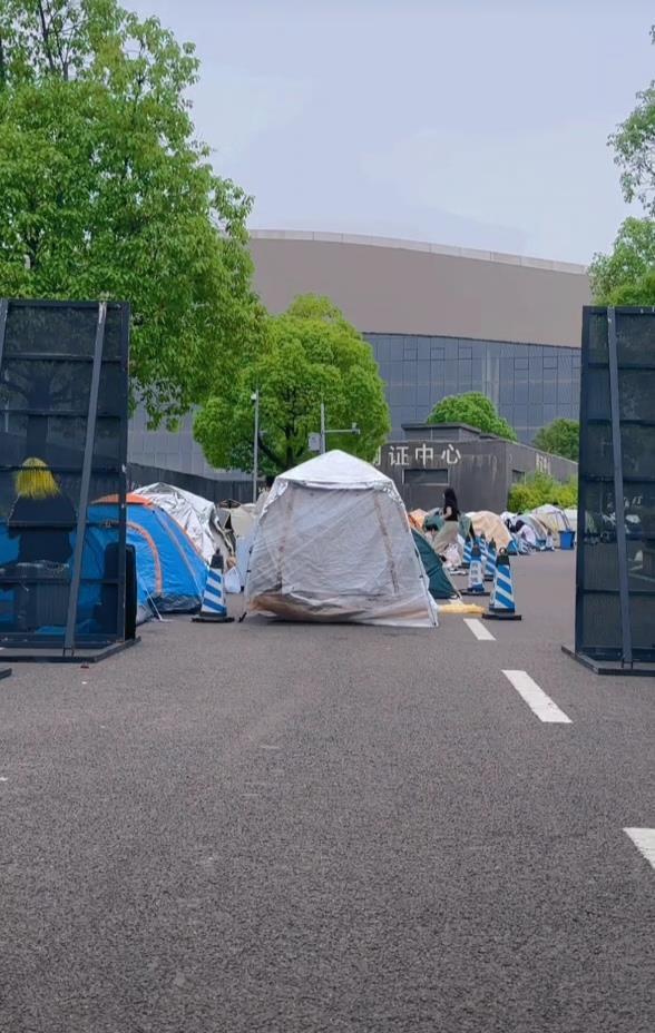 7月3日上午,極目新聞?dòng)浾咴诂F(xiàn)場(chǎng)的直播間看到,西博城主樓外側(cè)已經(jīng)搭起很多帳篷,隊(duì)伍比較長,帳篷頂部有防曬防雨膜。