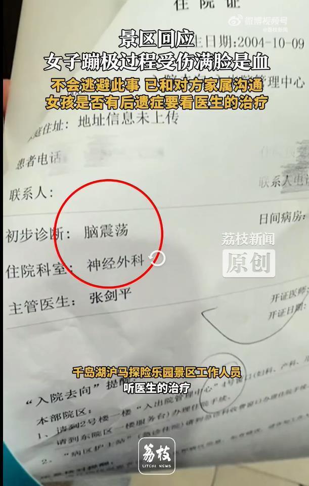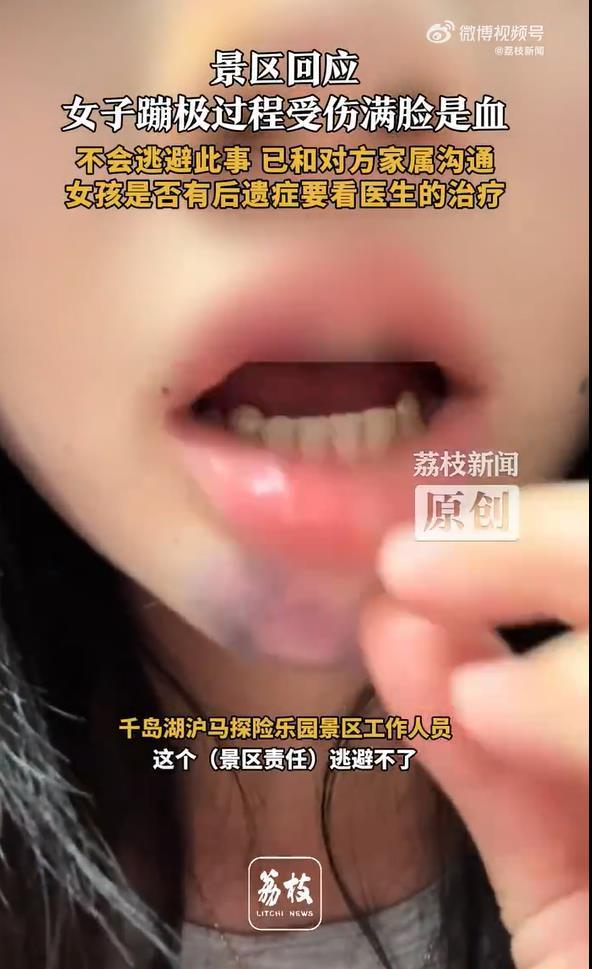 6月27日,浙江杭州千島湖滬馬探險樂園,夏女士閉眼體驗蹦極,被工作人員推下后受傷,滿臉是血,診斷為腦震蕩。當她索要保險單時,景區卻發來免責協議。7月2日,景區回應已和家屬溝通,不會逃避此事。(據7月2日荔枝新聞報道)