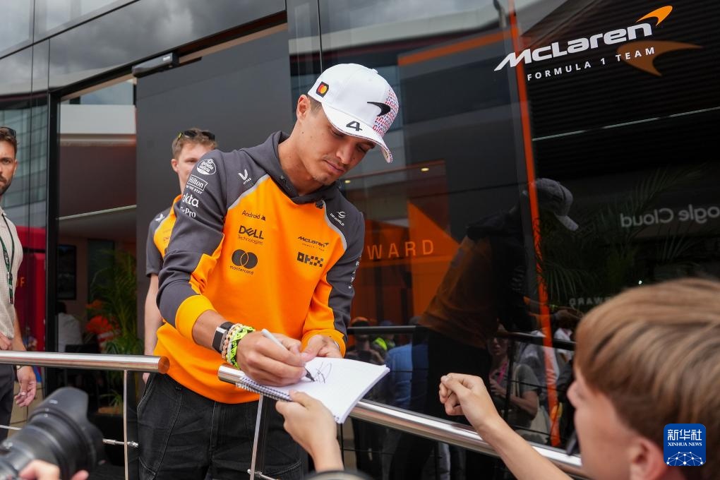 7月3日,邁凱輪車隊英國車手諾里斯(中)在活動中與車迷互動。新華社記者 吳魯 攝