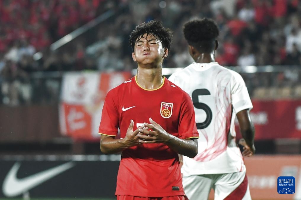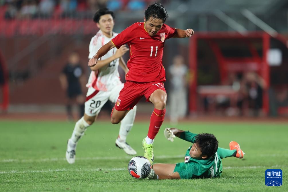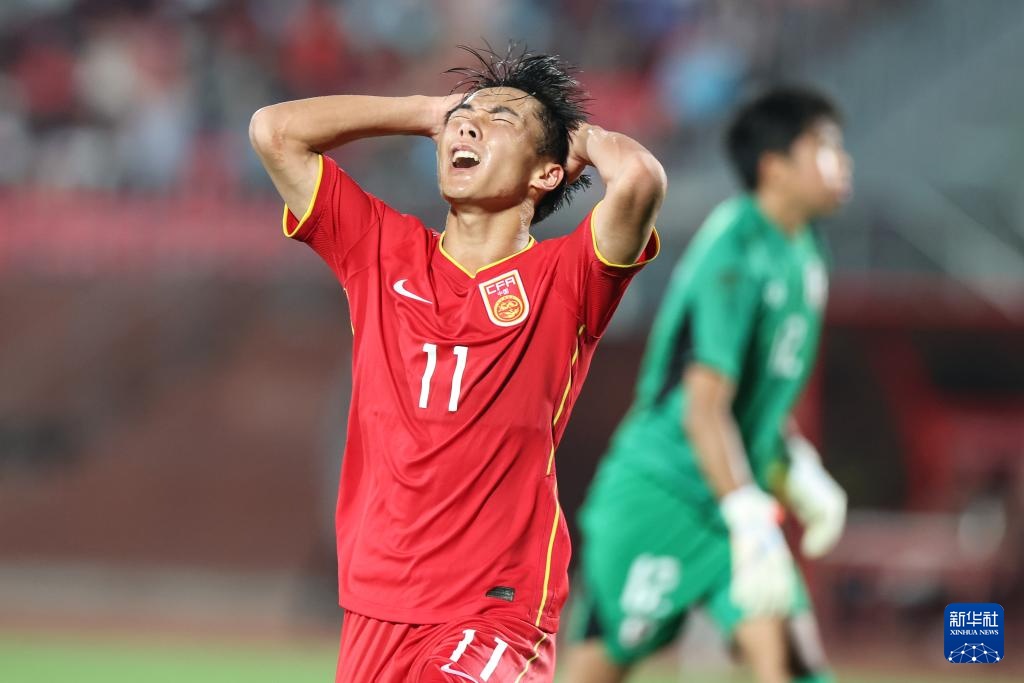 7月4日,中國隊球員帥惟浩(左)在比賽中錯失破門良機。新華社記者 李鋼 攝