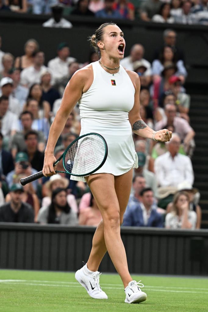 7月4日,薩巴倫卡在比賽中慶祝得分。新華社記者 趙丁喆 攝