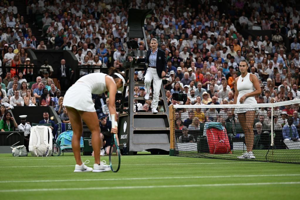 7月4日,薩巴倫卡(右)在比賽中關心拉杜卡努的受傷情況。新華社記者 趙丁喆 攝