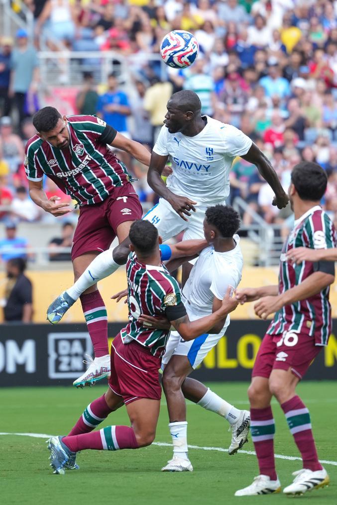 7月4日,利雅得新月隊球員庫利巴利(上右)和弗魯米嫩塞隊球員伊格納西奧(上左)在比賽中爭頂。新華社記者 許暢 攝