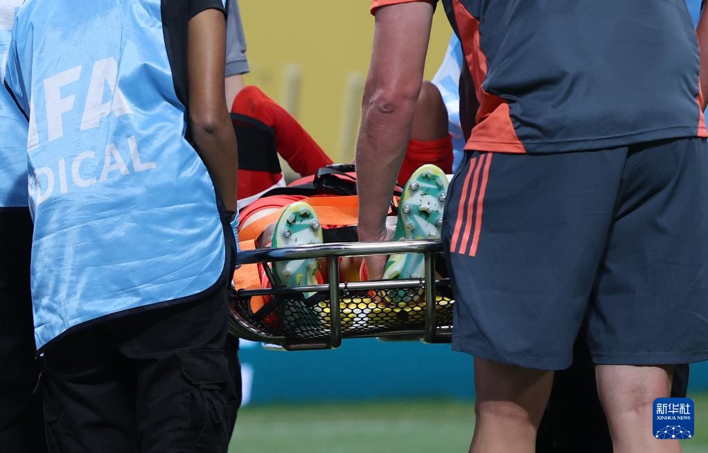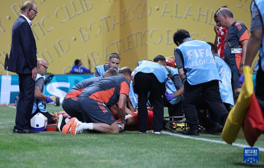 7月5日,醫護人員在場邊查看拜仁慕尼黑隊球員穆西亞拉傷勢。