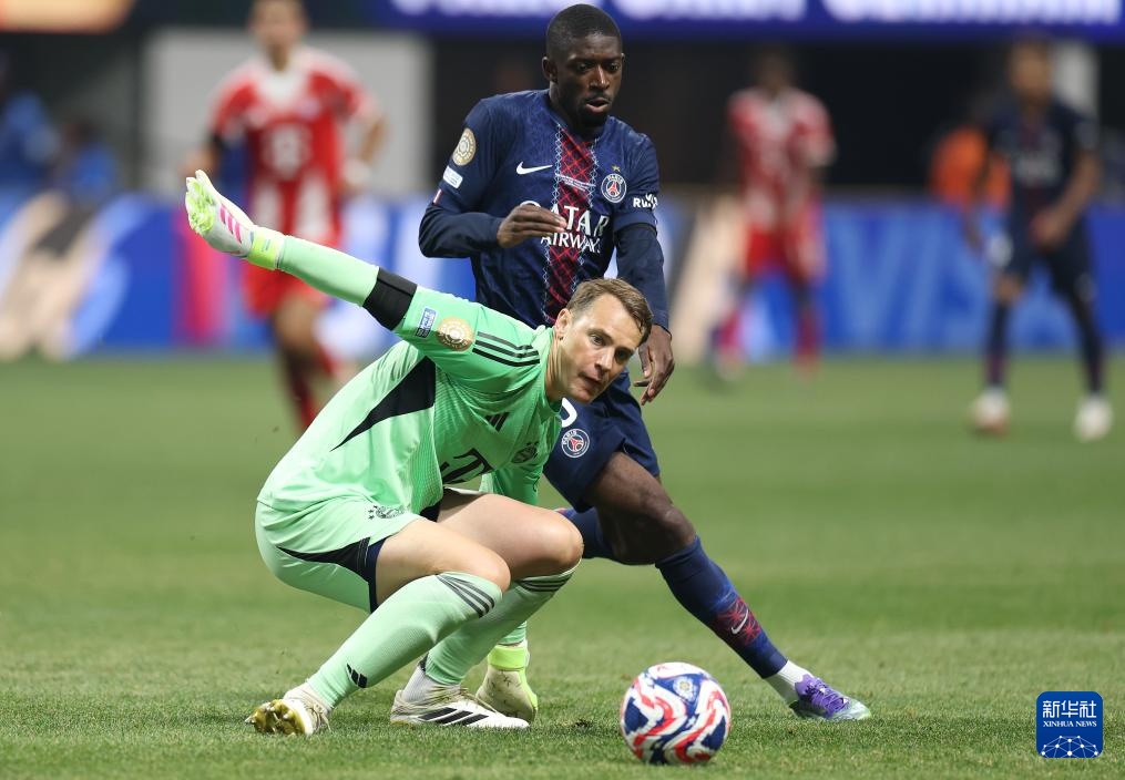 7月5日,拜仁慕尼黑隊門將諾伊爾(左)防守巴黎圣日耳曼隊球員登貝萊。