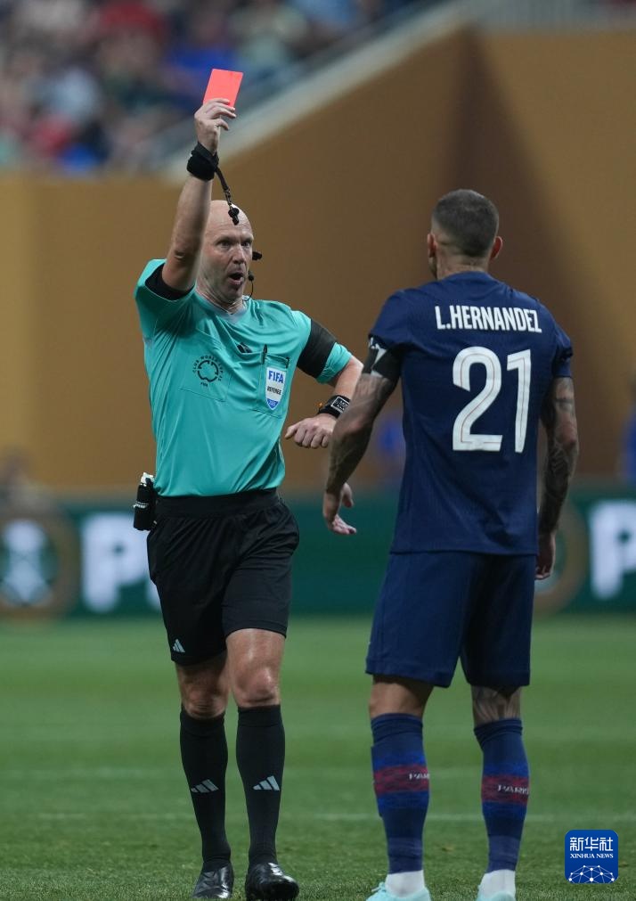 7月5日,主裁判安東尼·泰勒(左)向巴黎圣日耳曼隊球員盧卡斯·埃爾南德斯出示紅牌。