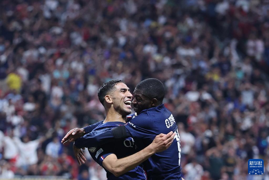 7月5日,巴黎圣日耳曼隊球員登貝萊(右)進球后與助攻其破門的隊友阿什拉夫·哈基米慶祝。