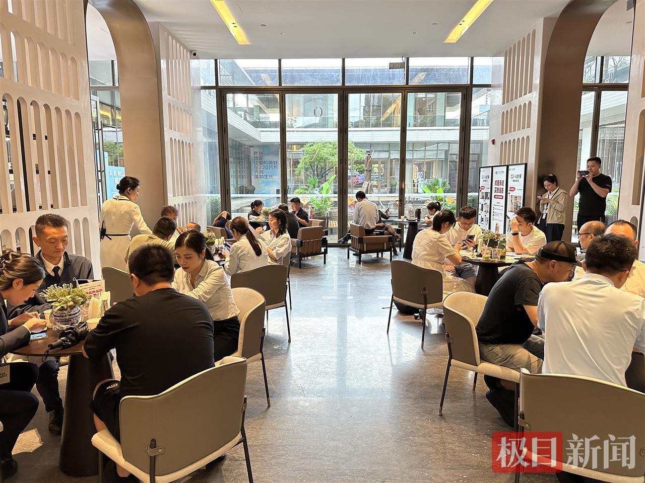 7月2日中午,在招商·武漢城建未來中心的銷售中心,洽談區12桌椅已全部坐滿,沙盤區、簽約區、茶水吧臺前擠滿咨詢客戶。置業顧問手持對講機穿梭帶看,樣板間門口甚至排起等待看房的隊伍。
