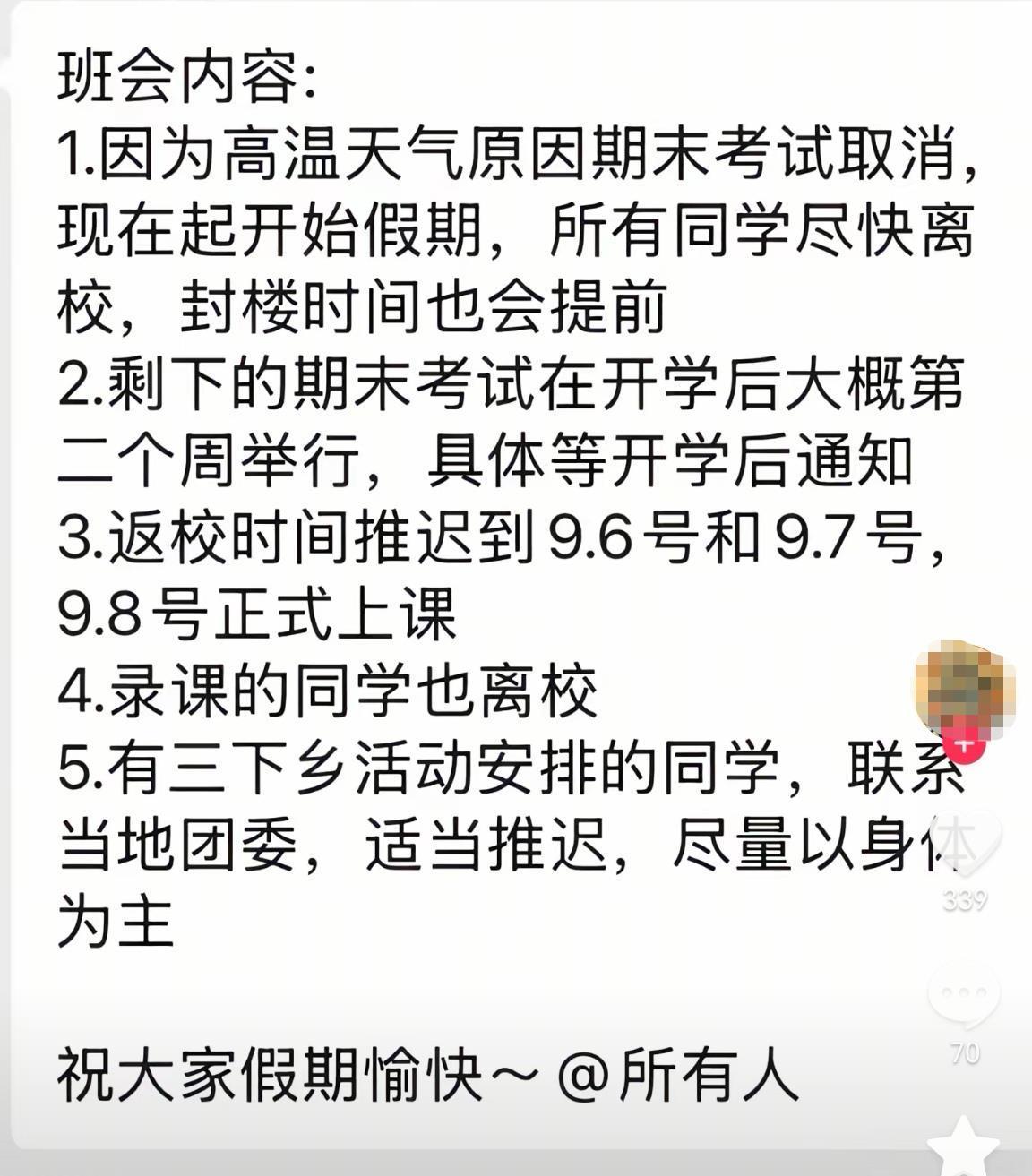 極目新聞記者注意到,網(wǎng)上多位自稱是山外學(xué)子和學(xué)長的網(wǎng)友5日晚在社交媒體上發(fā)文,有的展示“緊急通知”,稱6日的考試因天氣炎熱取消,改在開學(xué)第二周舉行,同學(xué)們可以離校。有的展示了“班會內(nèi)容”:1.因為高溫天氣原因期末考試取消,現(xiàn)在起開始假期,所有同學(xué)盡快離校,封樓時間也會提前;2.剩下的期末考試在開學(xué)后大概第二個周舉行,具體等開學(xué)后通知;3.返校時間推遲到9.6號和9.7號,9.8號正式上課。