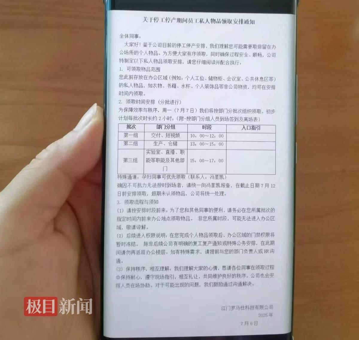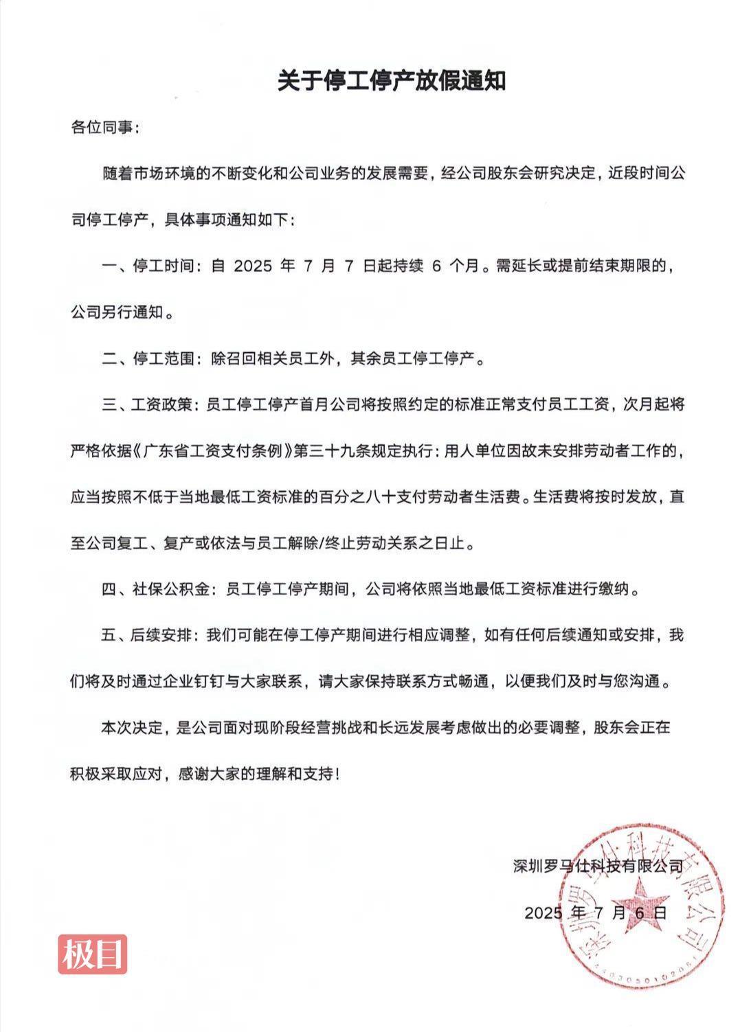 通知內容為:“隨著市場環境的不斷變化和公司業務的發展需要,經公司股東會研究決定,近段時間公司停工停產。停工時間為自2025年7月7日起持續6個月。需延長或提前結束期限的,公司另行通知。除召回相關員工外,其余員工停工停產。員工停工停產首月公司將按照約定的標準正常支付員工工資,次月起將依據當地最低工資標準的百分之八十支付勞動者生活費。生活費將按時發放,直至公司復工、復產或依法與員工解除/終止勞動關系之日止。員工停工停產期間的社保公積金,公司將依照當地最低工資標準進行繳納。”