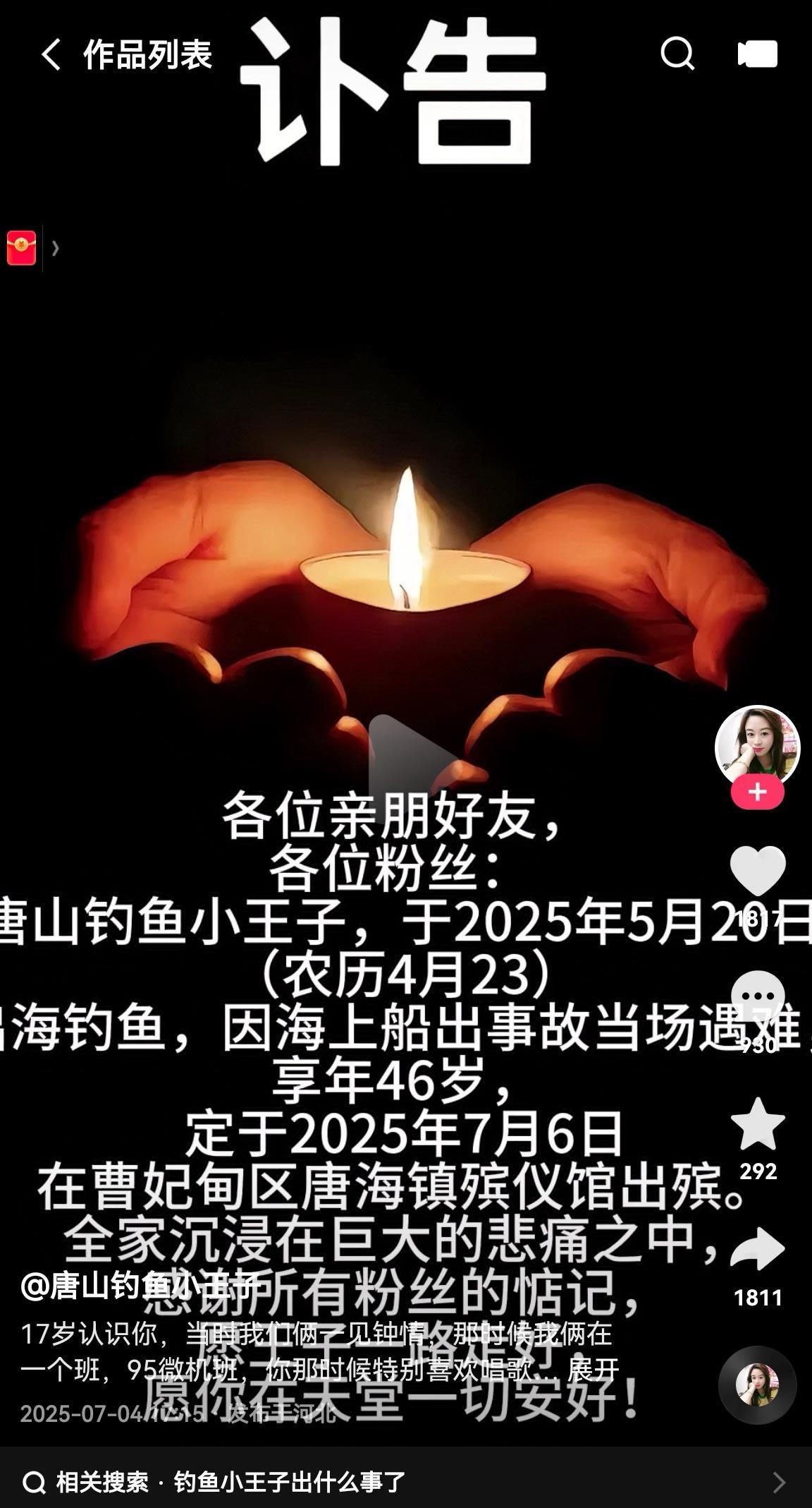 訃告說,各位親朋好友和粉絲:唐山釣魚小王子于2025年5月20日出海釣魚,因海上船出事故當場遇難,享年46歲,定于2025年7月6日在曹妃甸區唐海鎮殯儀館出殯。全家沉浸在巨大的悲痛之中,感謝所有粉絲的惦記。愿王子一路走好,愿你在天堂一切安好!