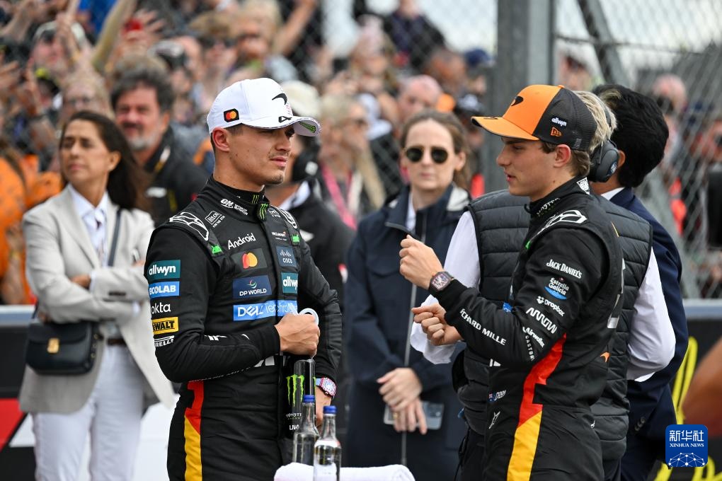 7月5日,獲得第二名的邁凱輪車隊英國車手諾里斯(前左)在排位賽后與獲得第三名的邁凱輪車隊澳大利亞車手皮亞斯特里(前右)在賽后交流。