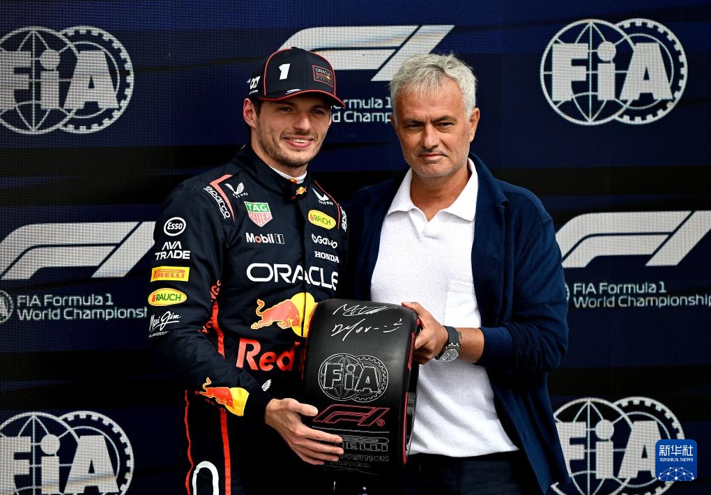 7月5日,獲得桿位的紅牛車隊荷蘭車手維斯塔潘(左)在賽后與葡萄牙籍足球教練穆里尼奧手持簽名輪胎合影。