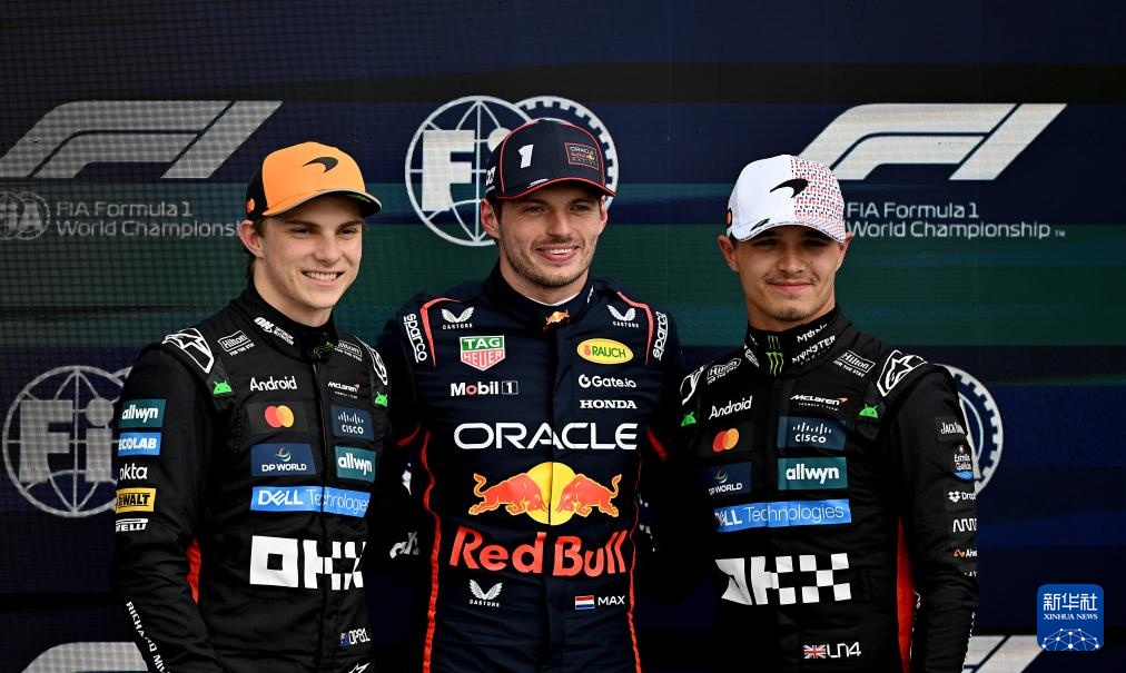 7月5日,獲得桿位的紅牛車隊荷蘭車手維斯塔潘(中)、第二名邁凱輪車隊澳大利亞車手皮亞斯特里(左)和第三名邁凱輪車隊英國車手諾里斯在賽后合影。