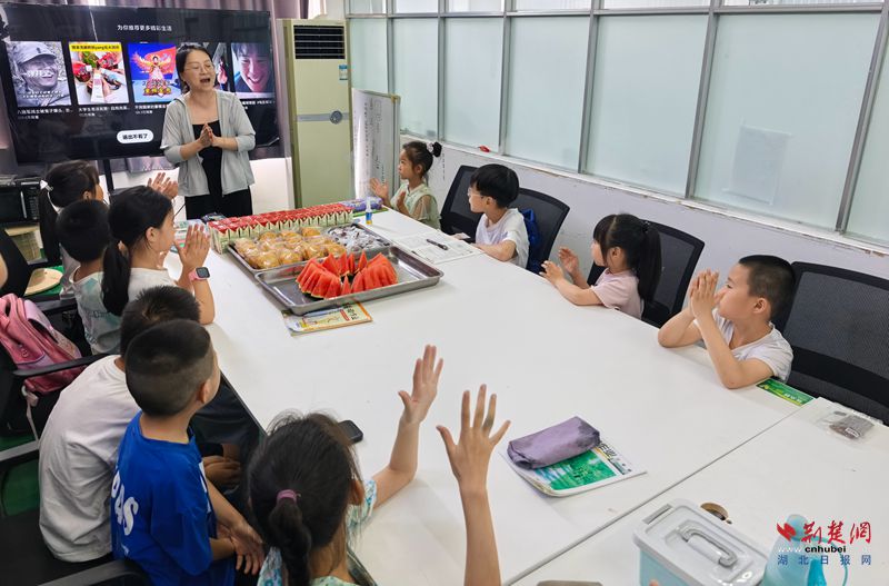 在夏歡作業區不遠,一間由辦公室騰出來的托管班傳來孩子們爽朗的笑聲。托管班內配備了空調、電扇、大屏電視,一名員工正帶著30余名孩子做手指操。負責托管班的公司行政文員方銀霞介紹,公司每天安排4名員工照顧托管班的孩子,2名新入職大學生員工負責輔導孩子們的暑假作業,每天下午還為孩子們發放應季水果和甜點。