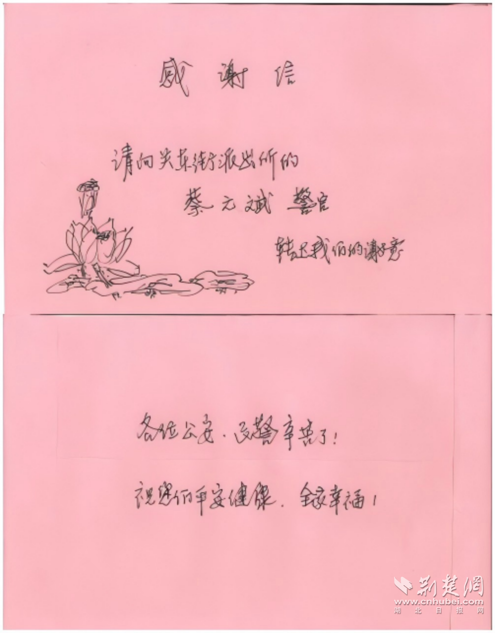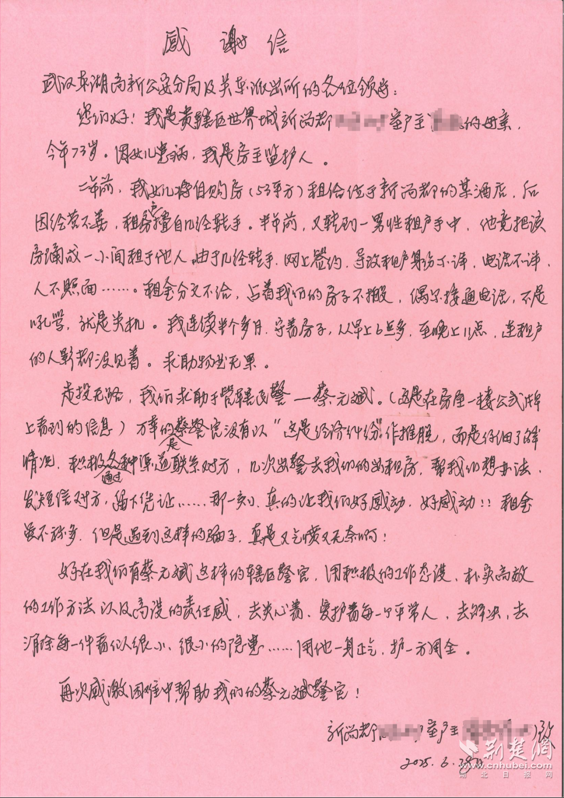 荊楚網(湖北日報網)訊(記者 白云 實習生 王玉林 通訊員 徐天羿)7月4日中午,烈日當空。一位白發老人頂著高溫,專程來到武漢市公安局東湖新技術開發區分局,將一封自己親手書寫的感謝信,鄭重地交到門衛手中,再三囑咐一定要交給關東街派出所的蔡元斌警官。一封樸素的信,道出了一段民警用心化解積年糾紛的暖心故事。