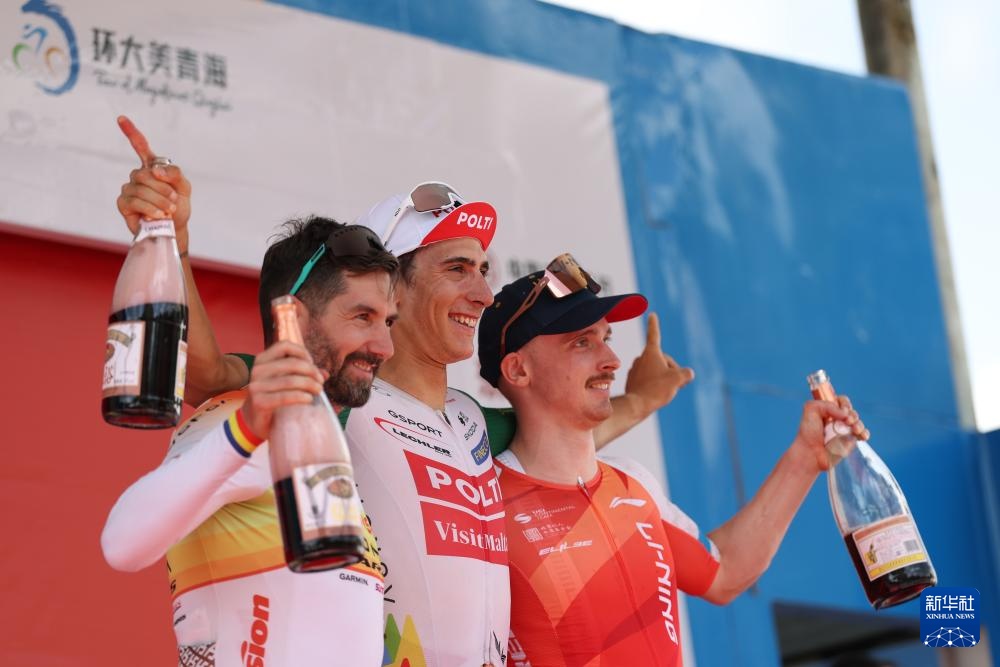 7月6日,獲得賽段前三名的意大利波蒂—探索馬耳他車隊車手佩納維爾(中)、桓盛—VONOA—泰山體育洲際隊車手格羅蘇(左)、李寧之星車隊車手謝爾比在領獎臺上合影。新華社記者 張龍 攝