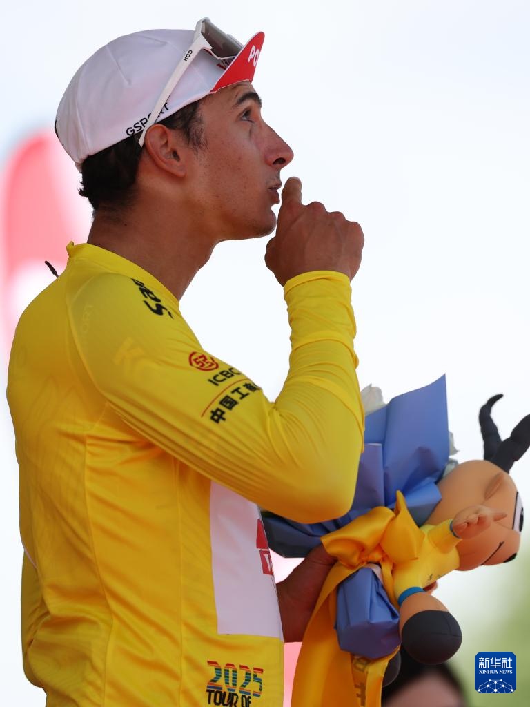 7月6日,意大利波蒂—探索馬耳他車隊車手佩納維爾身著代表總成績第一的黃衫在領獎臺上。新華社記者 張龍 攝