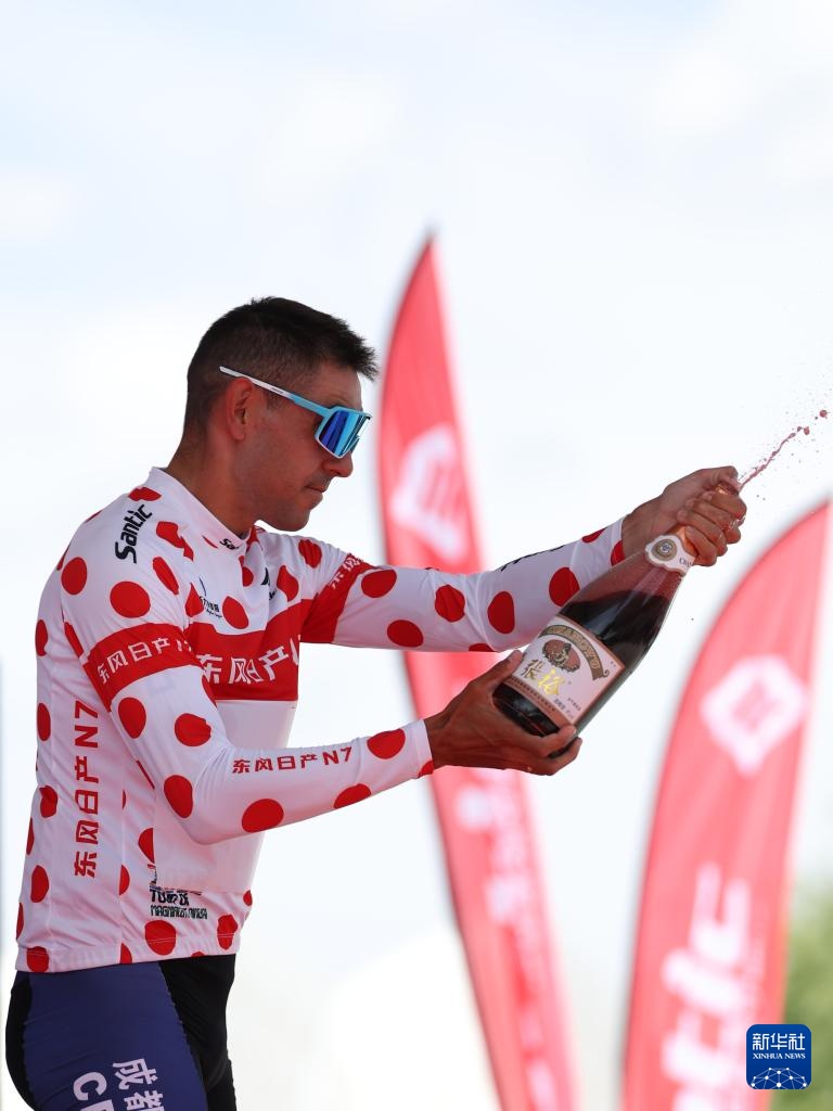 7月6日,成都DYC洲際隊車手伊萬諾夫身著代表爬坡總積分第一名的圓點衫在領獎臺上噴灑香檳。新華社記者 張龍 攝