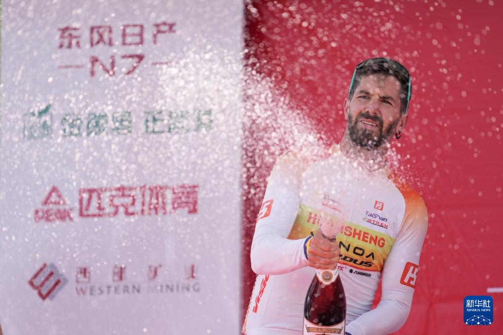 7月6日,賽段第二名桓盛-VONOA-泰山體育洲際隊車手格羅蘇在領獎臺上噴灑香檳。