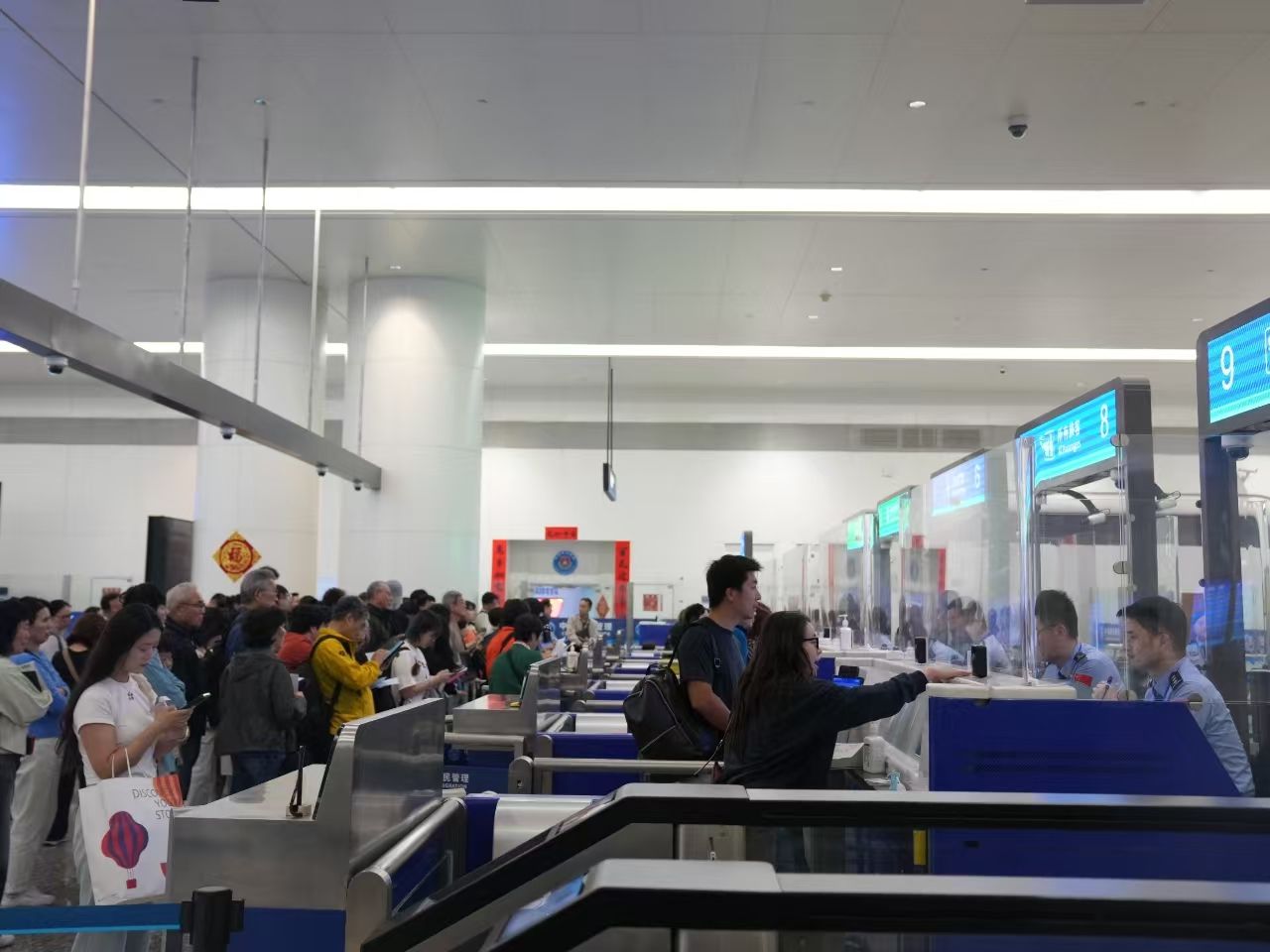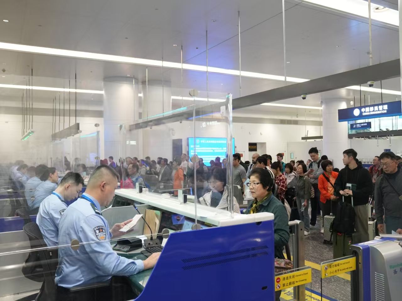 武漢天河國際機場口岸大廳里,旅客正在辦理邊檢手續。通訊員王璐穎攝