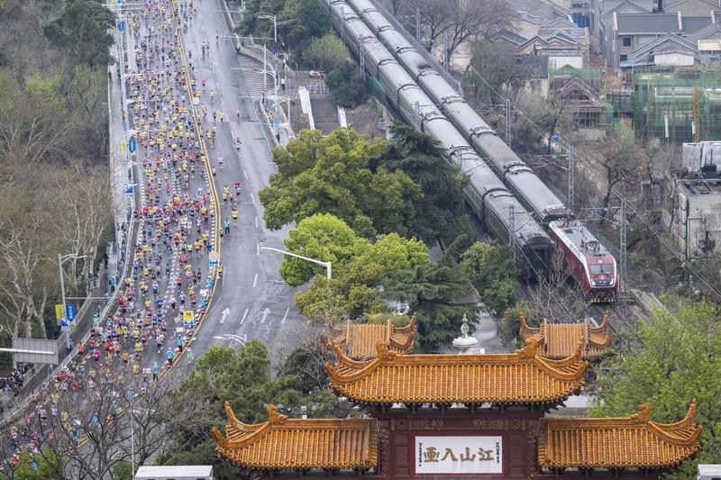 3月23日,武漢馬拉松參賽選手經過黃鶴樓。新華社記者 伍志尊 攝