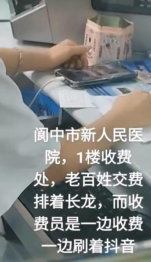 7月7日,有網友發視頻稱,四川南充閬中市人民醫院收費窗口處,一名工作人員在崗位上邊工作邊用手機刷短視頻。