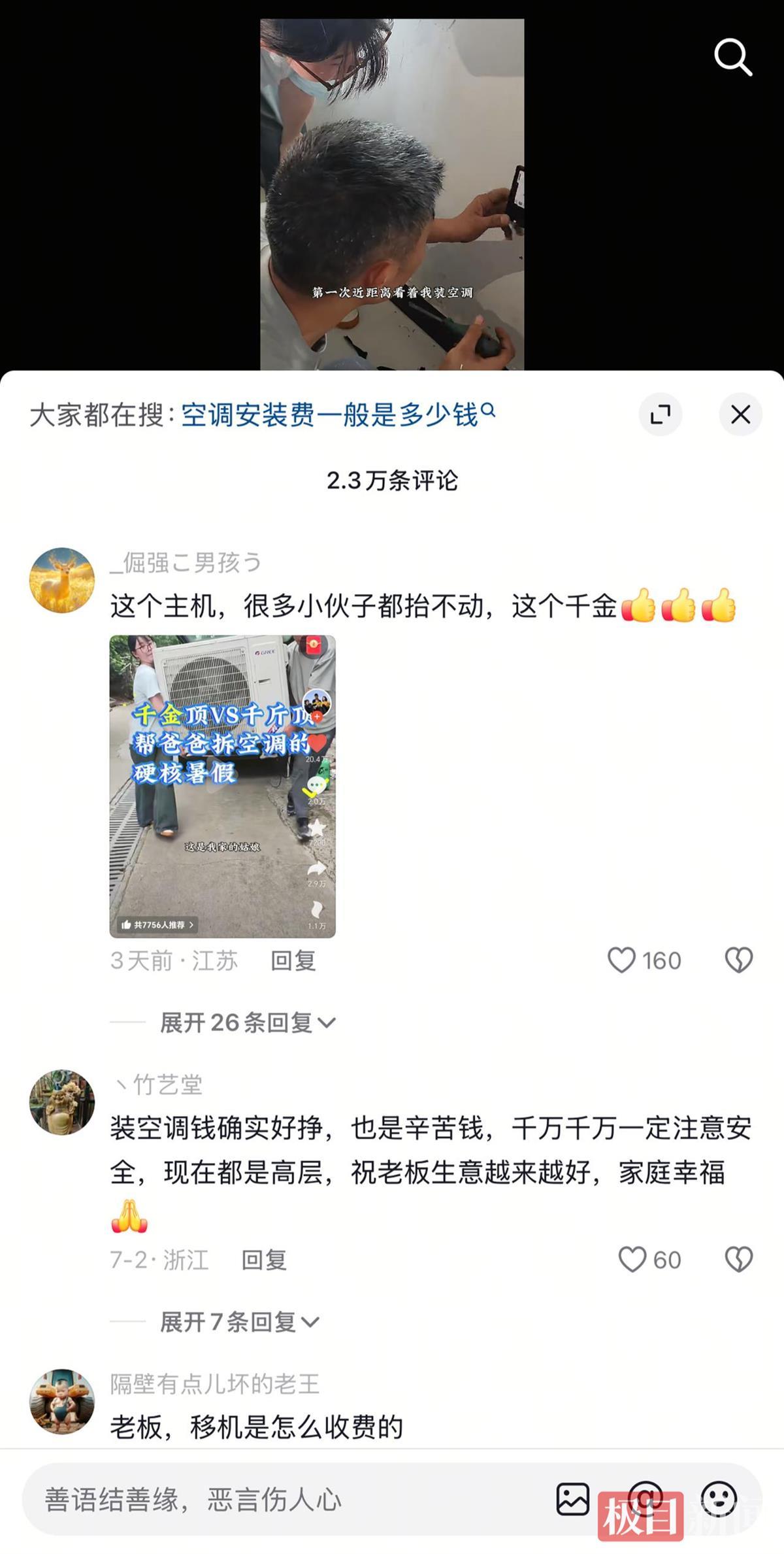 在袁先生發出的視頻下面,已經有2.3萬條評論,網友們紛紛夸贊女孩的孝順,還有部分網友開始詢問袁先生家里裝空調如何收費。
