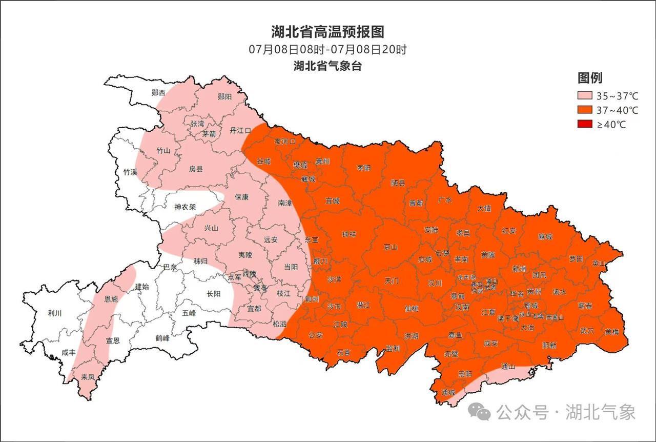 湖北省氣象臺7日15時56分繼續發布高溫橙色省級預警:預計7月8日白天,除西部高山地區外,我省大部分地區最高氣溫將升至35℃以上,其中襄陽、隨州、荊門、荊州、天門、潛江、仙桃、武漢、孝感、鄂州、黃岡、黃石、咸寧可達37℃以上,局地40℃,請注意防范。