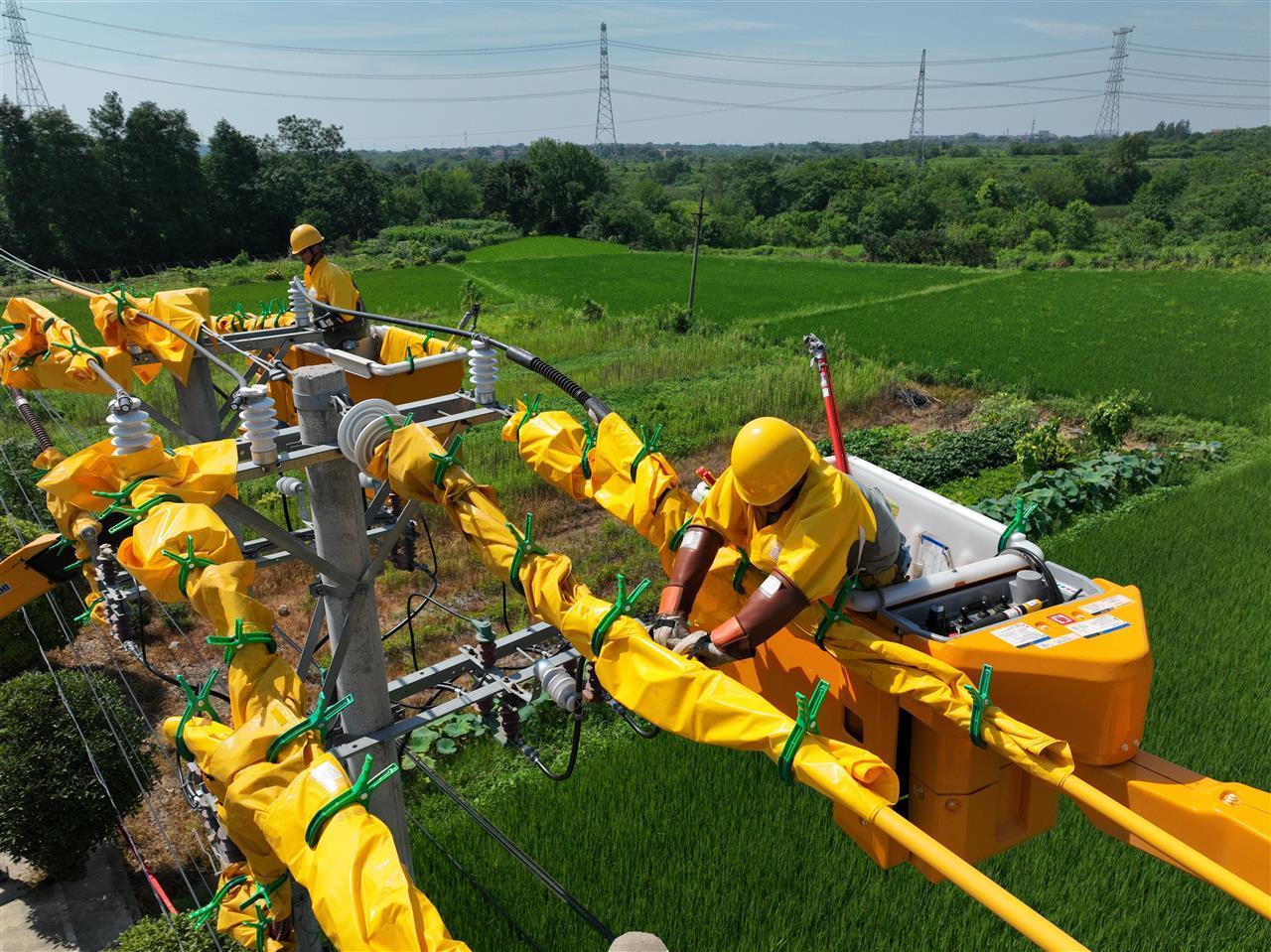 國網武漢供電公司“電知音”共產黨員服務隊進行帶電作業,確保居民不間斷供電