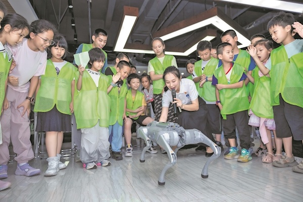 7月7日,“湖北武漢12355青少年服務臺”暑假愛心托管班開班,老師給孩子們帶來一堂人工智能體驗課程,孩子們與機器狗親密互動。 楚天都市報極目新聞記者常怡 通訊員武小青攝