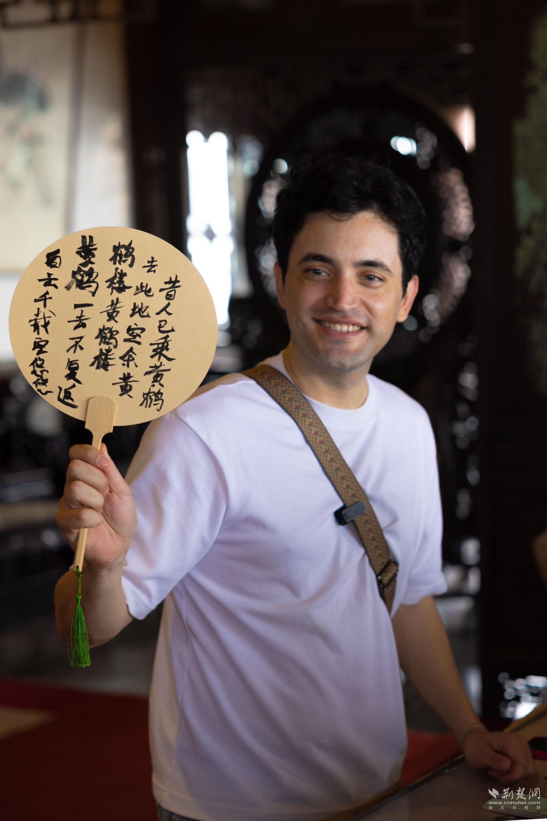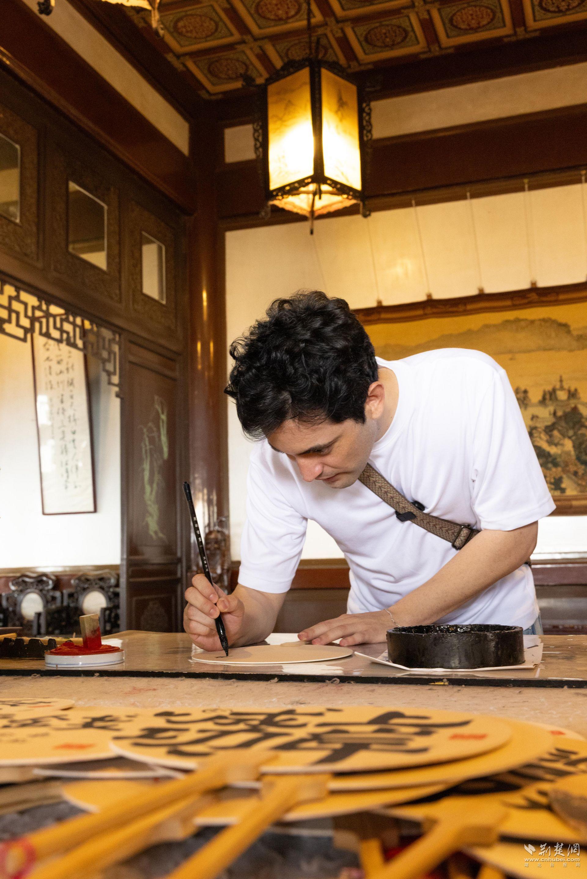 黃鶴樓內,博主們被寫在扇子上的書法作品深深吸引,阿根廷博主功必揚更是躍躍欲試,拿起毛筆在扇子上書寫起來。