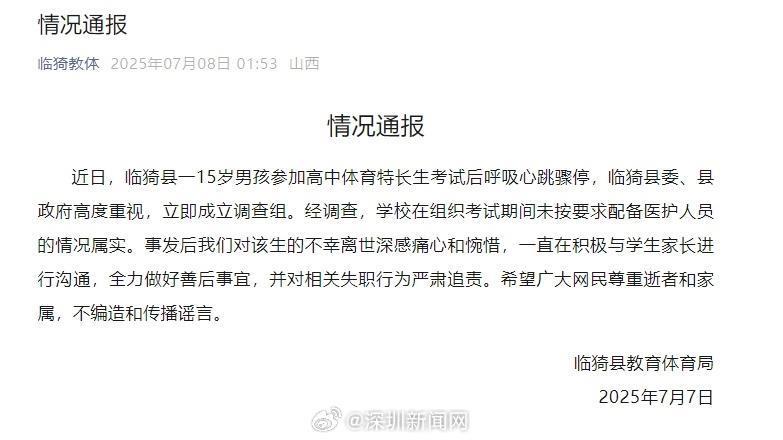 6月25日,網傳山西臨猗縣一15歲男孩參加臨猗縣第三中學體育特長生考試時猝死,家屬質疑校方未在黃金時間段內有效施救,且考試未按要求配備相應保障措施。