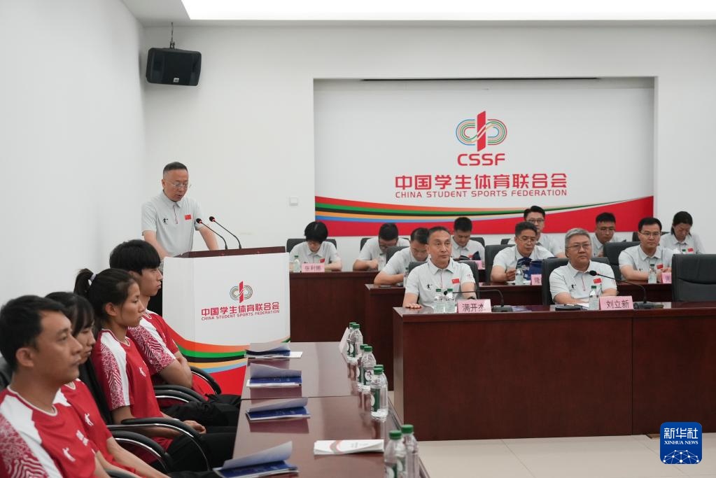 7月8日,教育部學生體育協會聯合秘書處副秘書長、中國學生體育聯合會副主席、第32屆大運會中國代表團執行團長滕連帥(左上)在主會場出征儀式上發言。新華社記者 胡星宇 攝