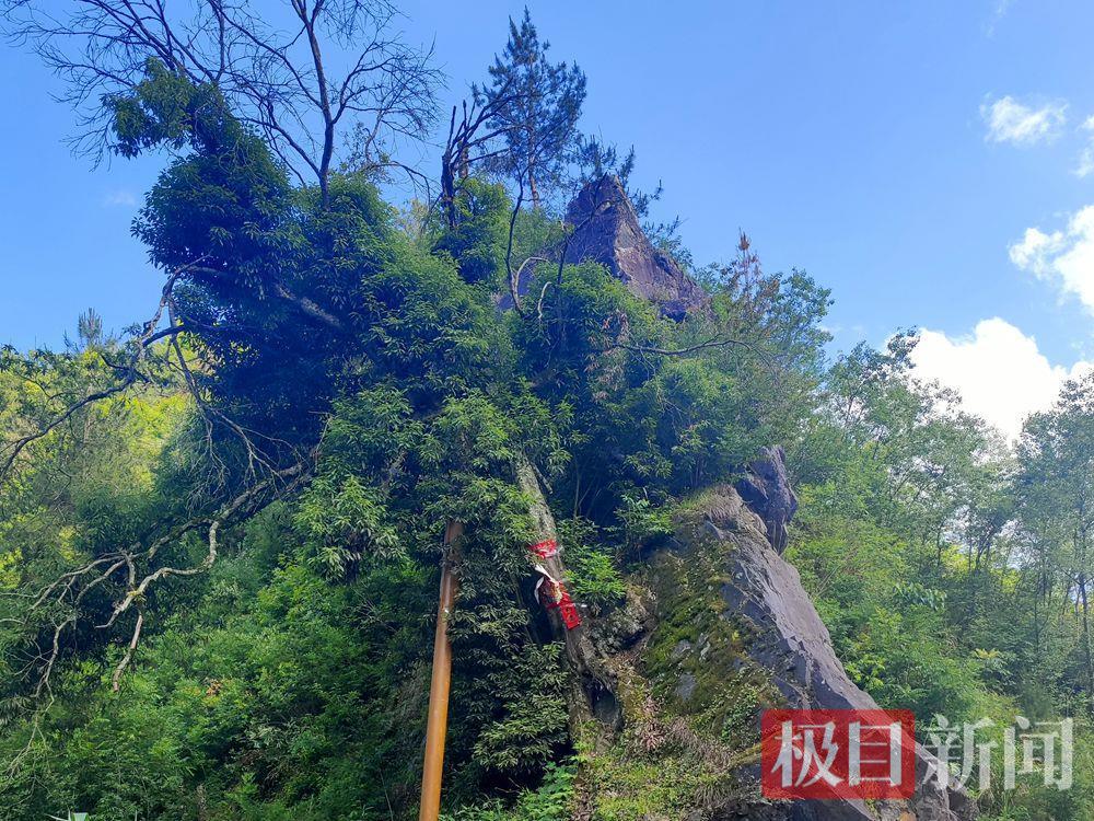 筆者在現(xiàn)場看到,這棵參天古樹翠綠欲滴、郁郁蔥蔥、生機(jī)勃發(fā)。它的根盤踞在接近85度坡度的絕壁懸崖側(cè)面,粗壯的虬根順著崖壁伸向腳下的石縫。絕壁之上只有零星的苔蘚,其他植物幾乎無法生長。目測這棵樹的胸圍大約有2米多,樹高15米左右,粗壯的虬枝向四面伸展開來。