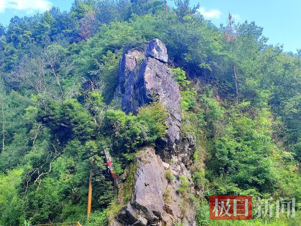 從安河口村沿著澗溝路,一路前行,發(fā)現(xiàn)一棵古樹盤根在絕壁之上。絕壁頂上,有一塊孤立的方形巨石,好似一枚印章。