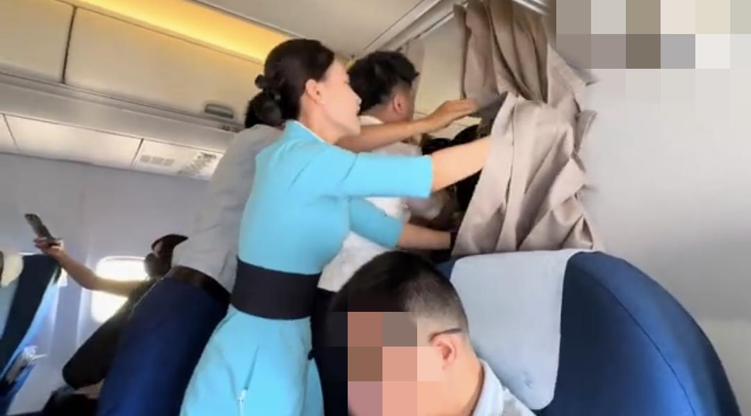 乘客發布的視頻顯示,在一架飛機上,多名拿著手機等拍攝設備的人員,試圖強行闖入一處機艙,3名空乘人員反復提醒阻止。其中一名空姐稱,“別往前擠了,飛機還沒停呢。”