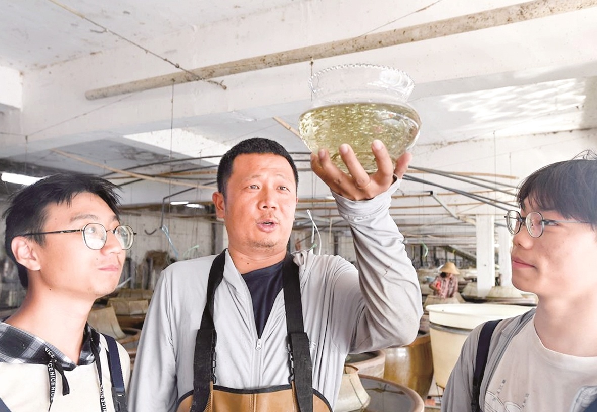 孫夢(中)和水產養殖專業的實習生一起查看魚苗 楚天都市報極目新聞記者王永勝攝